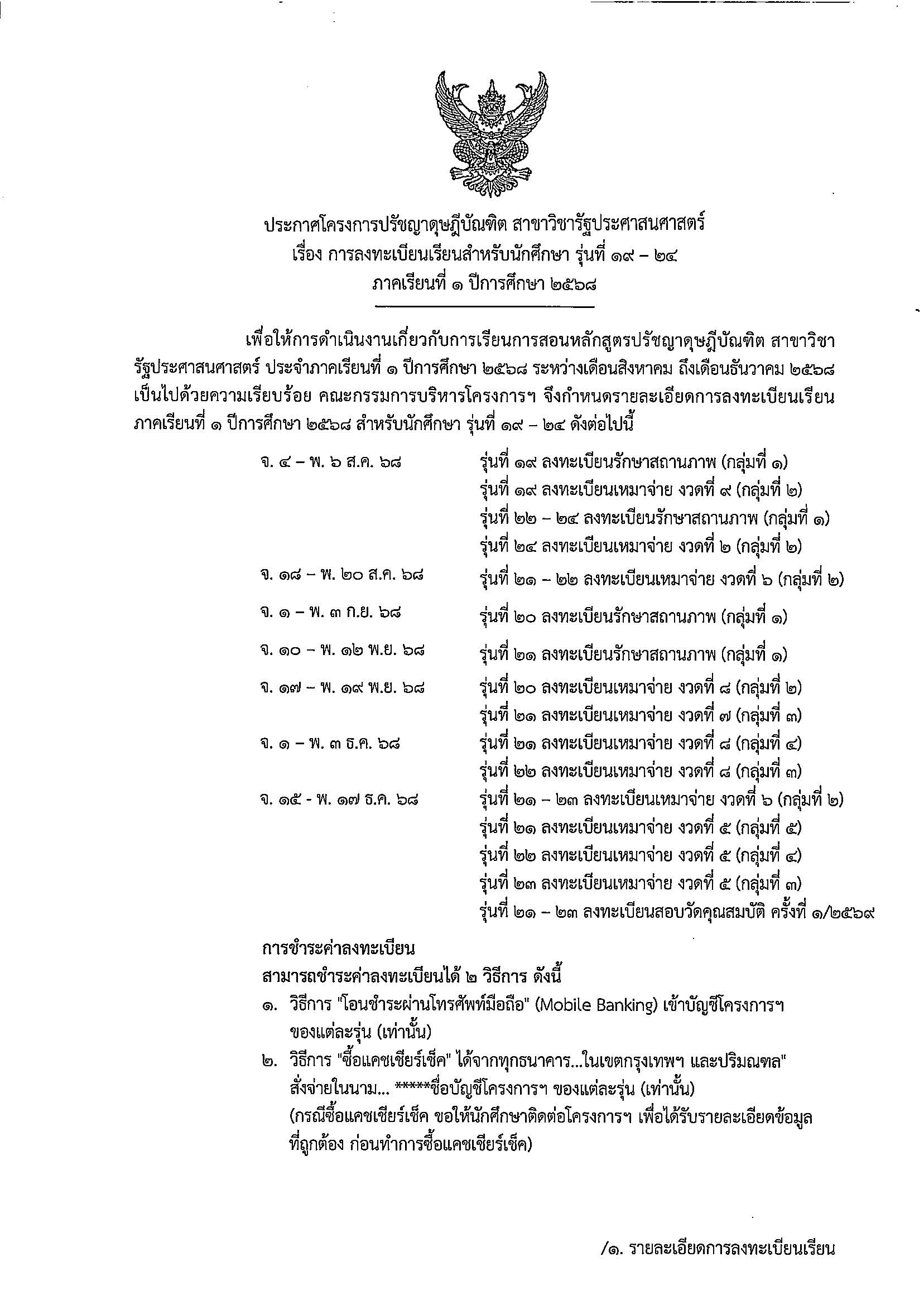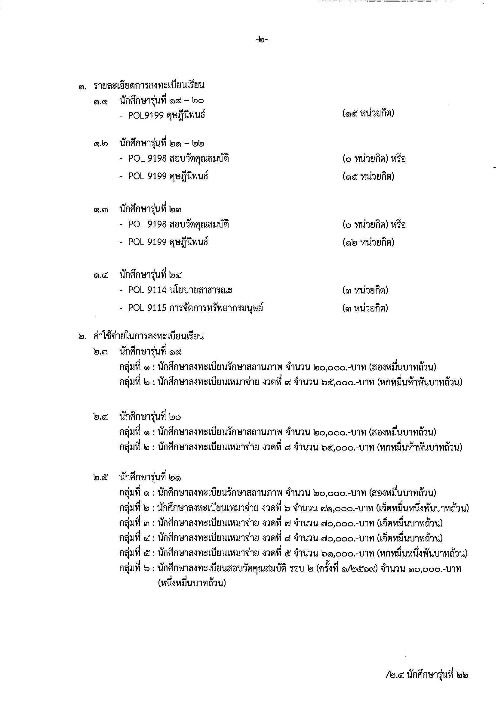 กำหนดการลงทะเบียนเรียนสำหรับนักศึกษา รุ่นที่ 19-24