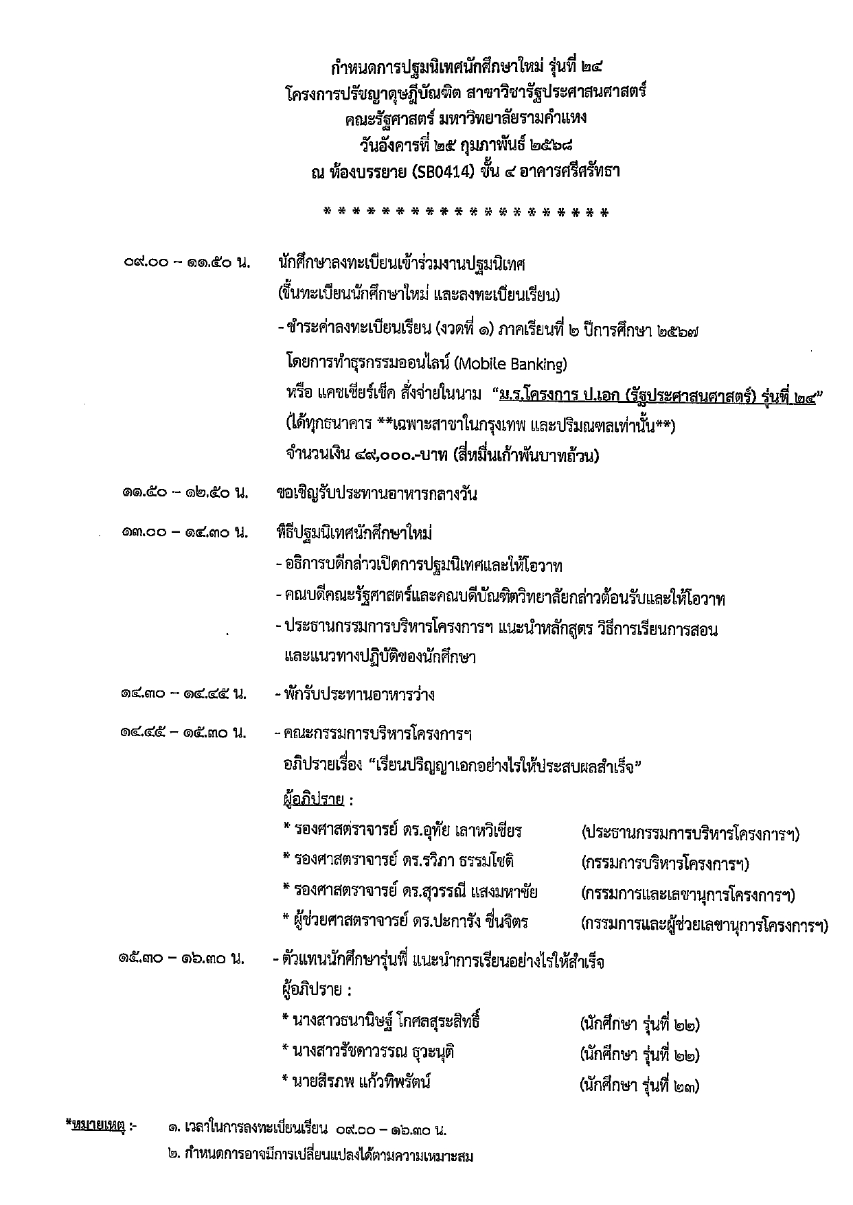 กำหนดการปฐมนิเทศนักศึกษาใหม่ รุ่นที่ 24