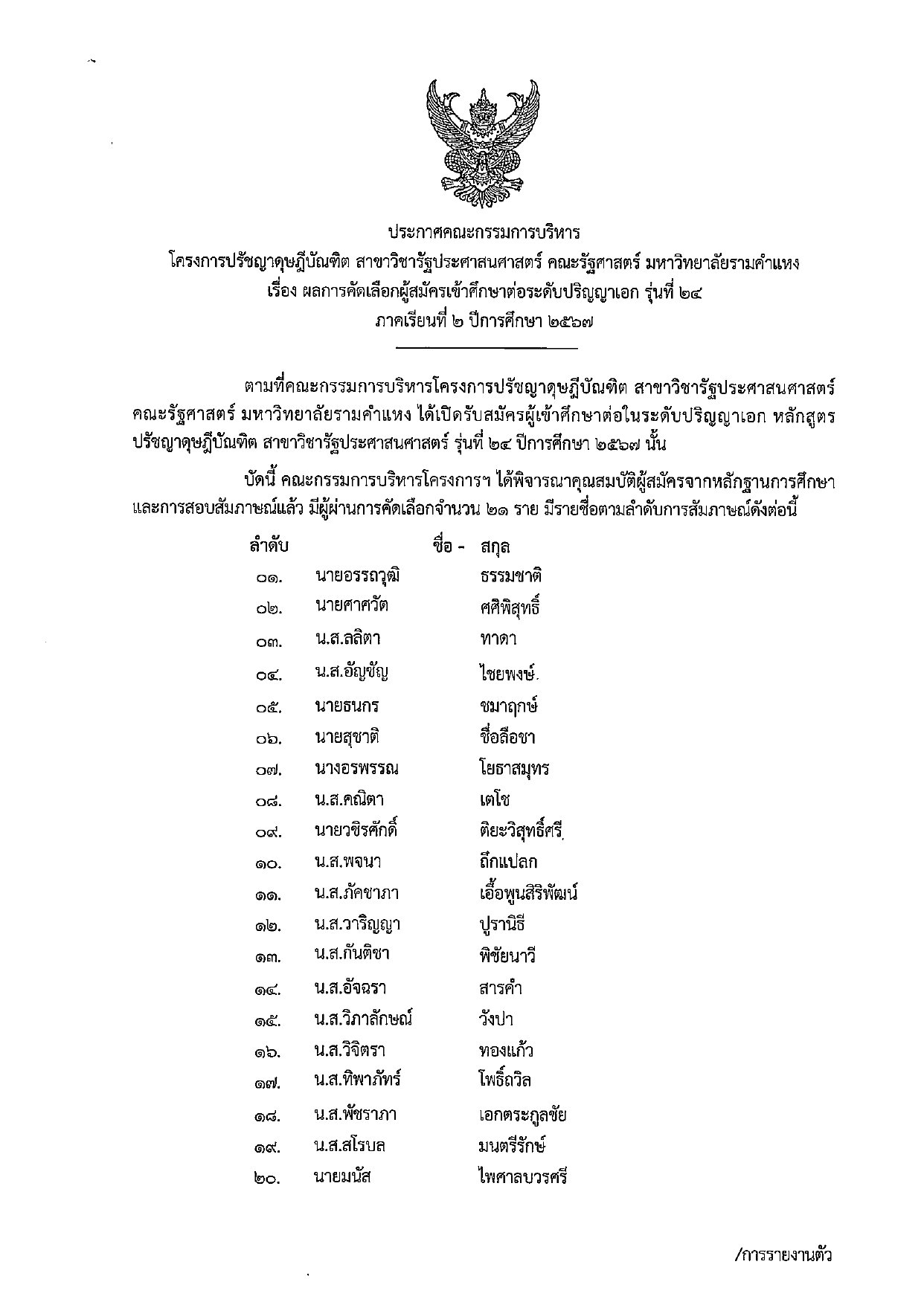 ผลการคัดเลือกผู้สมัครเข้าศึกษาต่อระดับปริญญาเอก รุ่นที่ 24