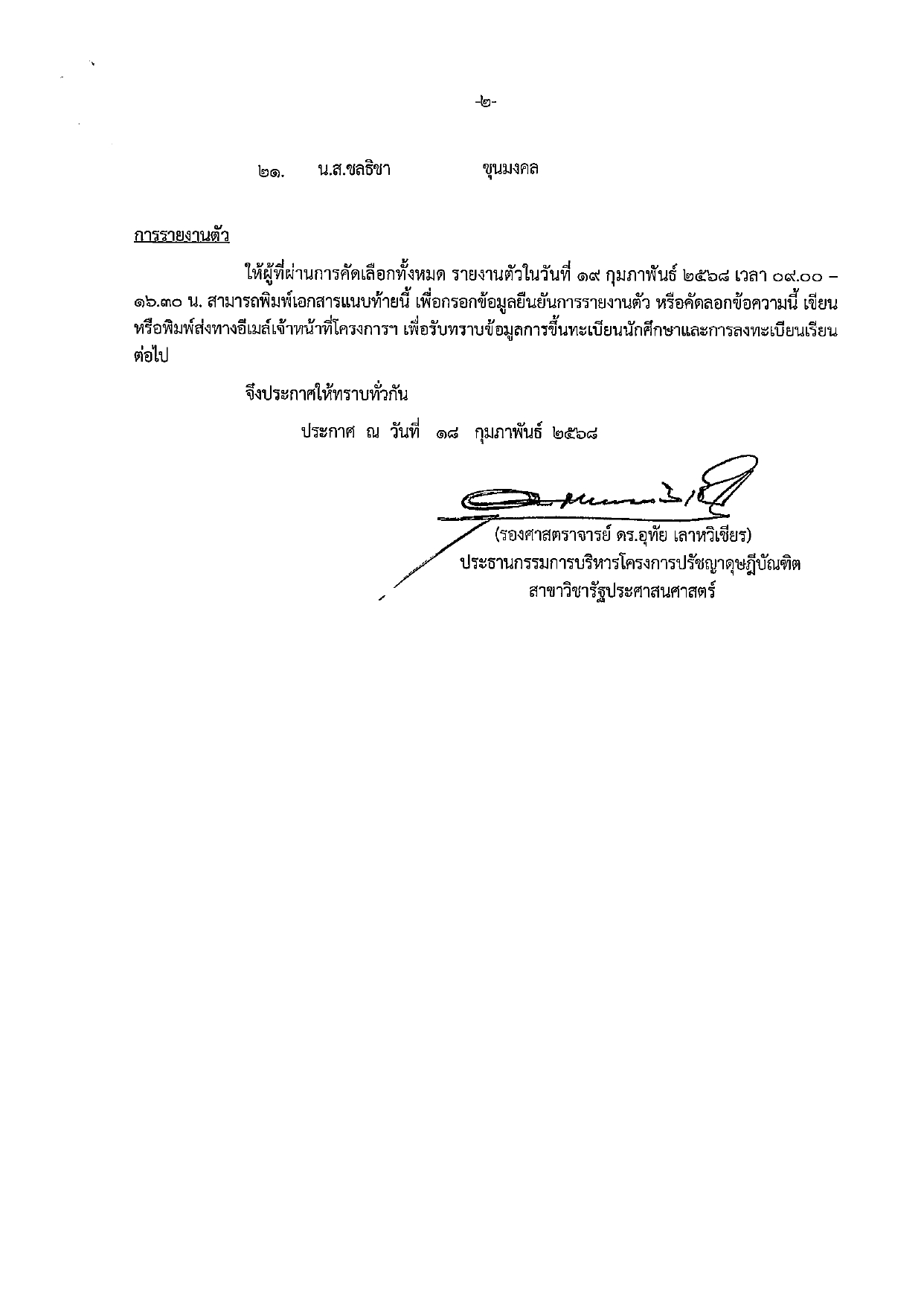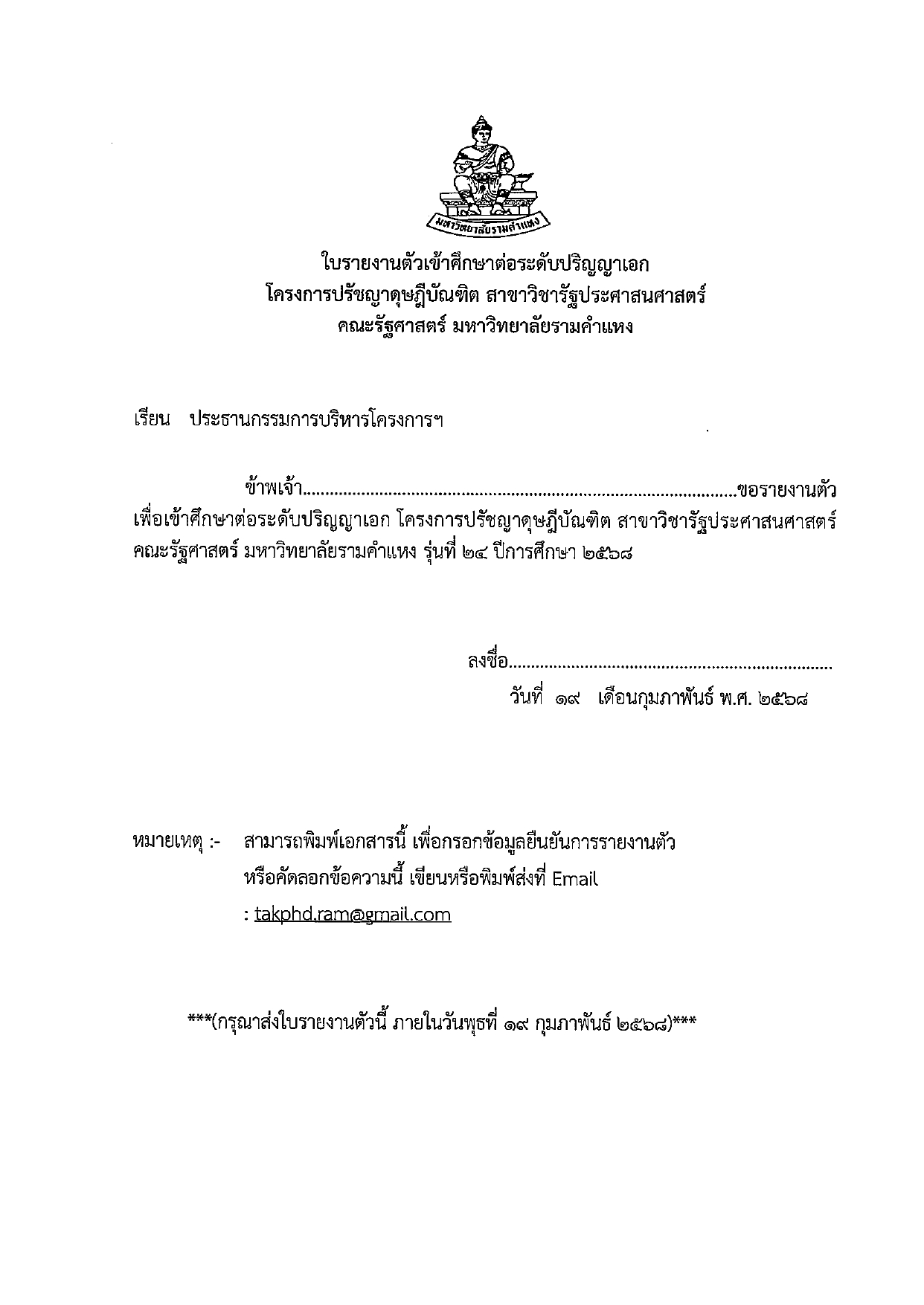 ใบรายงานตัวเข้าศึกษาต่อระดับปริญญาเอกโครงการปรัชญาดุษฎีบัณฑิต สาขารัฐประศาสนศาตร์