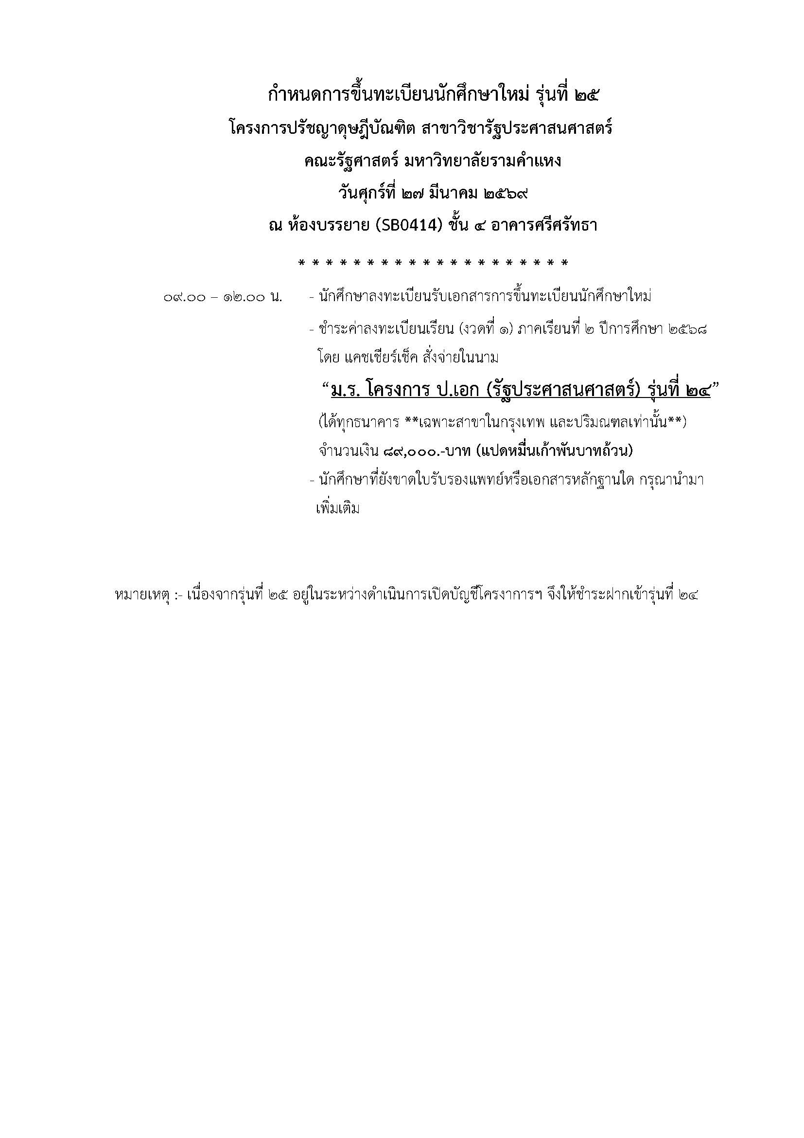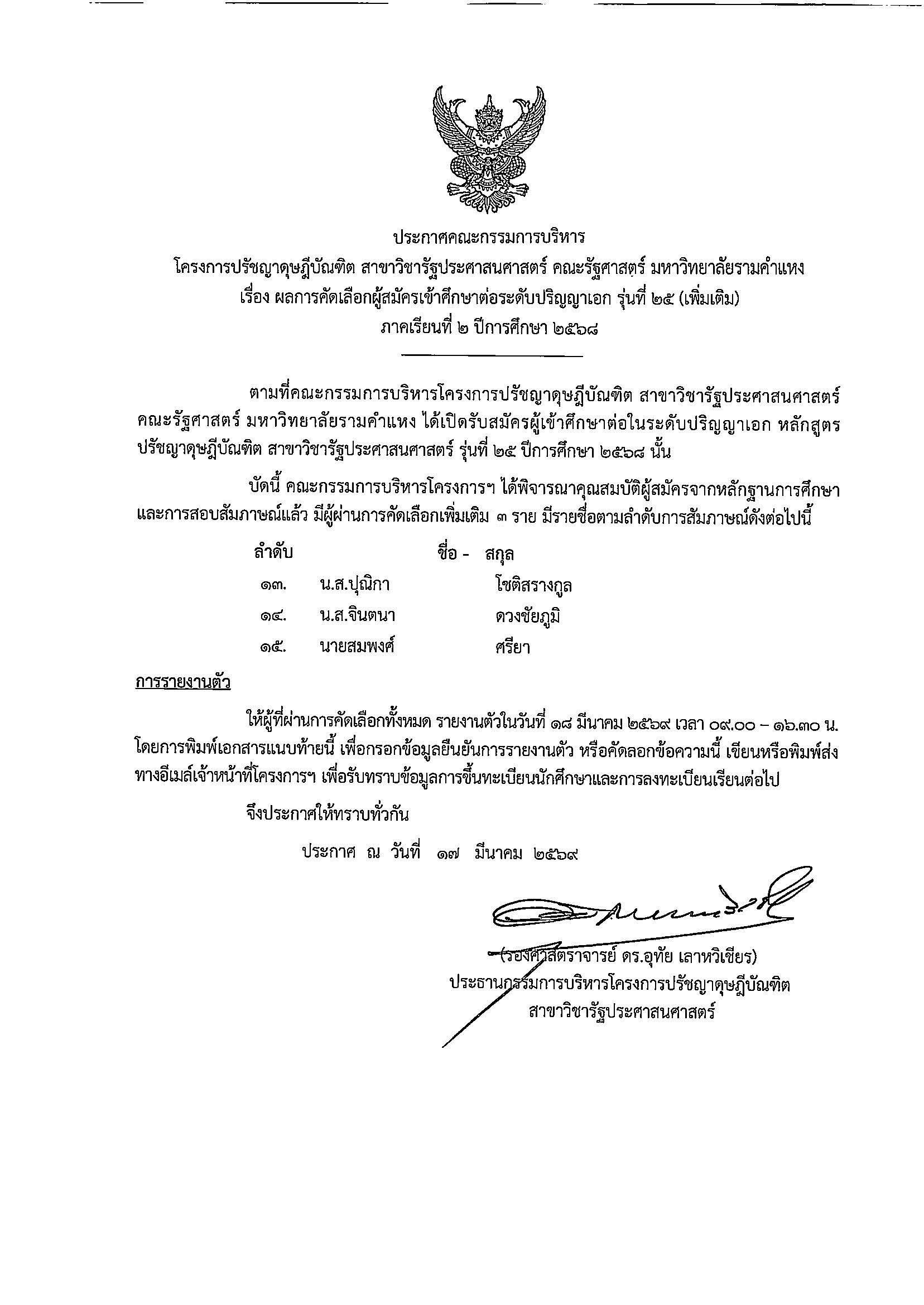 เรื่อง ผลการคัดเลือกผู้สมัครเข้าศึกษาต่อระดับปริญญาเอก รุ่นที่ 25 (เพิ่มเติม1)